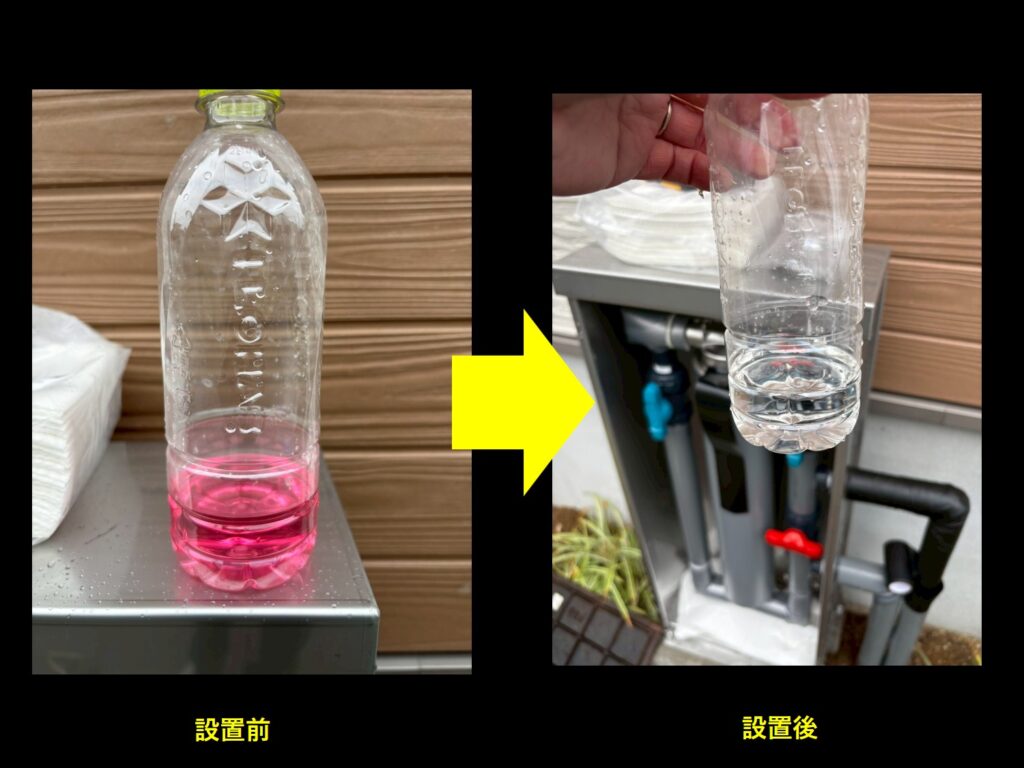 設置前は濃いピンク色に発色していた水道水がReFINE設置後は発色のないキレイな浄水になっています!