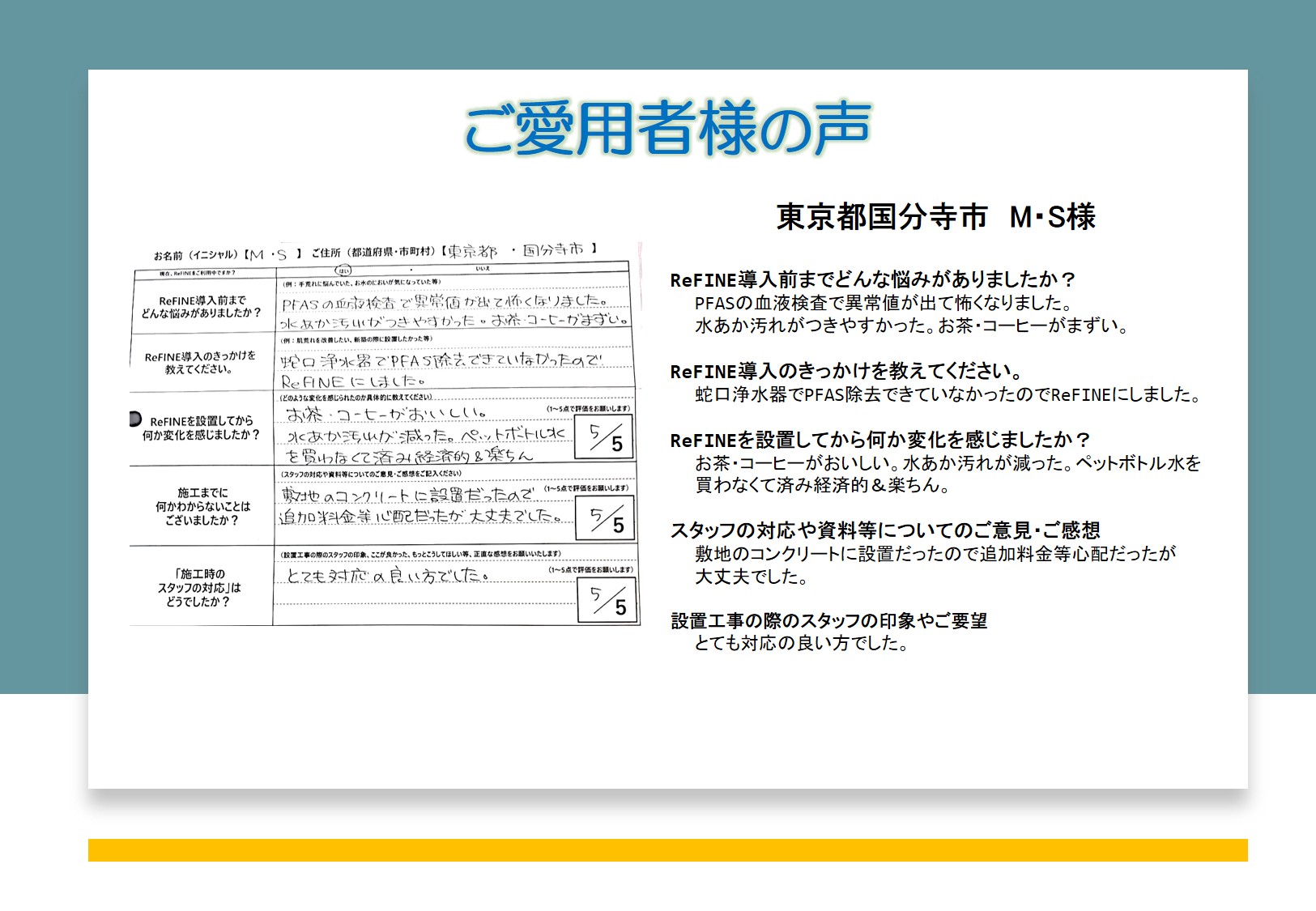 S・M様も血液検査での結果を受けてPFAS除去対応の浄水器を検討された結果、家中のお水が浄水になるReFINEを導入を決めたそうです。